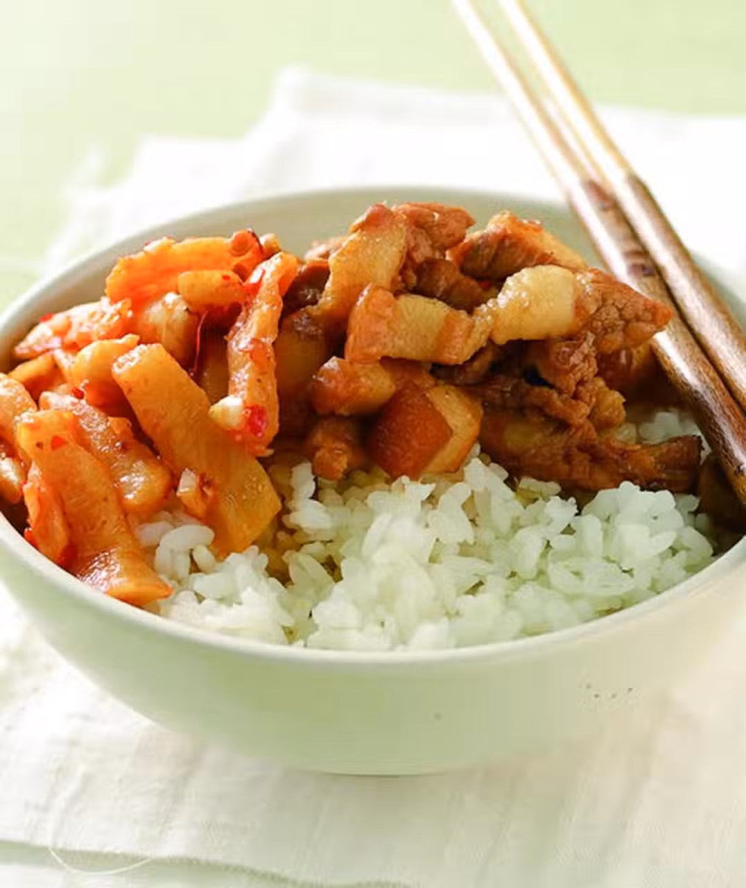 3 在作法2的鍋中放入作法1的五花肉條炒至油亮,放入所有調味料炒香
