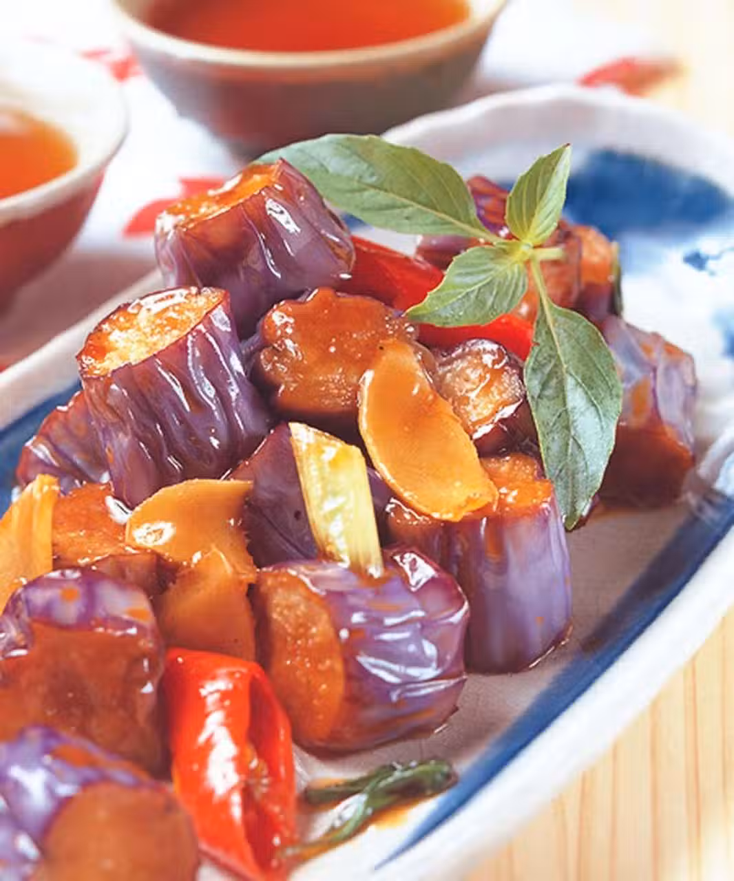 5 放入作法2的茄子拌炒,在收汁前,加入九層塔拌炒即可。