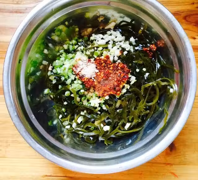 2、準備生薑,大蒜,小蔥,將它們都切成末備用。取一個盆,把瀝干水分的海帶放進去,加入薑末、蔥末、蒜末、鹽、白醋、糖、生抽、陳醋、辣椒油、麻油攪拌均勻。