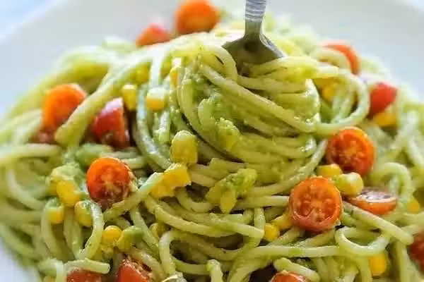 2、做好的牛油果泥和煮熟的意麵拌勻,加一些小番茄和玉米粒就完成啦。