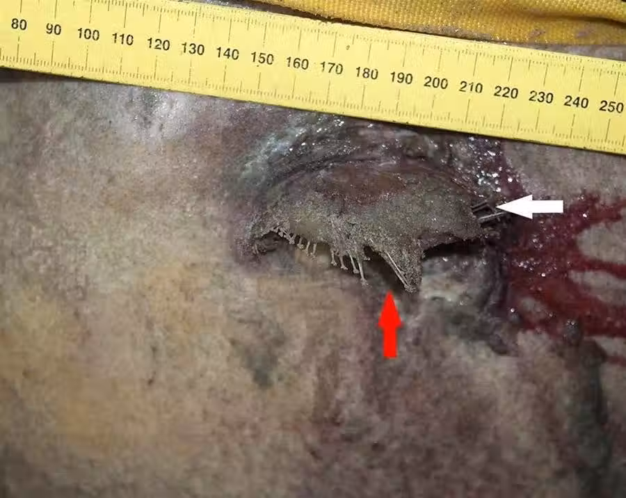 切開呼吸孔後,科學家把這條卡住鯨魚的魚取了出來。