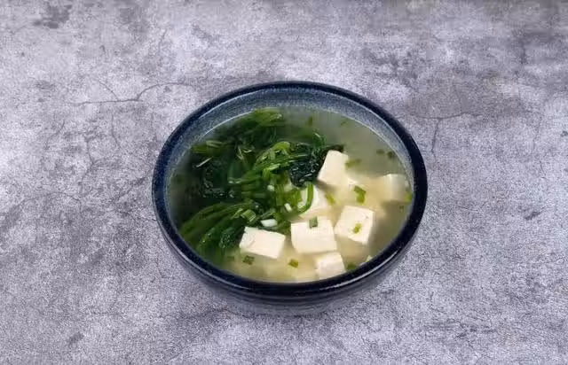 材料:豆腐、菠菜、蔥姜、鹽、雞精、清水、油。
