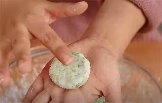 5.簡單的揉成團之後,我們直接取一小部分,在掌心攥瓷實,然後按壓成圓餅的形狀。