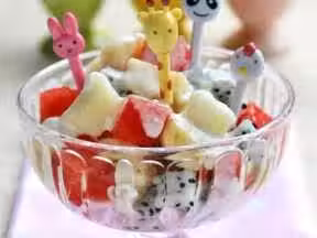 3 把火龍果、蘋果、香蕉、西瓜粒放入碗裡,在上面淋上優酪乳即可