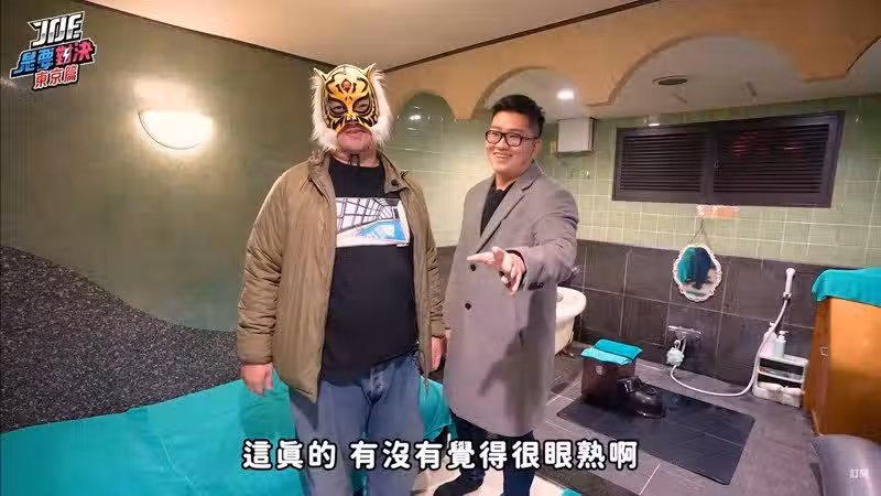 YouTuber「Joeman」(右)帶眾人體驗日本泡泡浴,也讓他們相當驚訝洗泡泡浴的場景有既視感。(翻攝自Joeman YouTube頻道)