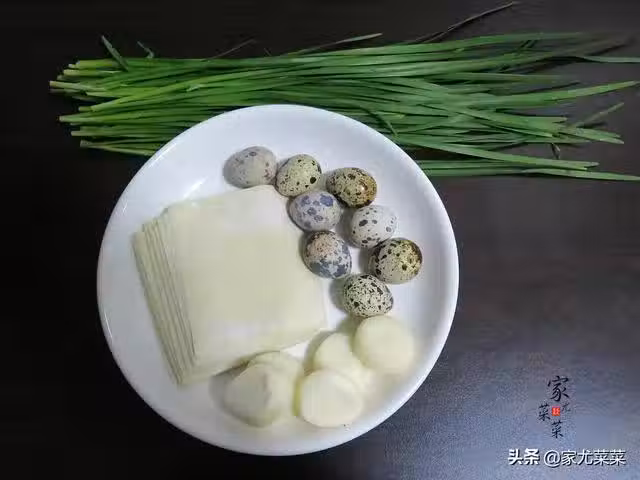 2、餛飩皮中放入韭菜和馬蹄,再打入一個鵪鶉蛋,餛飩皮4個角蘸點水疊起來