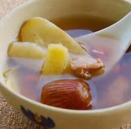 3將瘦肉放入湯煲;加入洗凈的淮山片和蜜棗;加入蔥段和薑片;加入足量水(800ml左右);中火滾開後,轉小火煲二個半小時左右,放入枸杞,繼續煲半小時;出鍋前加少許鹽調味。