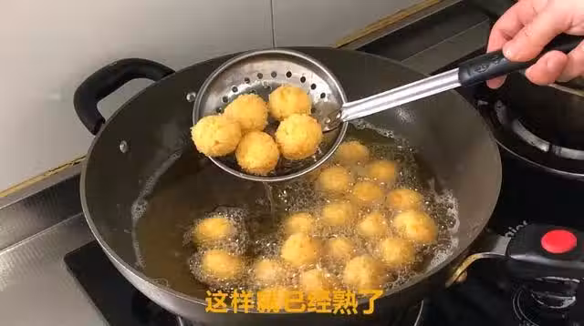丸子油炸一遍撈出,把鍋內的雜質也撈出,大火燒到9成熱,看到鍋內油表面的氣泡消失了,就可以放入丸子復炸了,復炸的好處是,丸子突然受熱,外皮會酥脆,而裡面會暄軟,再就是能使丸子快速脫油去膩,這樣炸出來的丸子吃起來不油膩。所以說復炸很重要哦