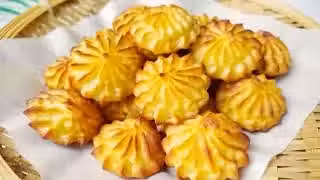 3. 把土豆泥裝入裱花袋中,在鋪好油紙的烤盤上,擠出花型。