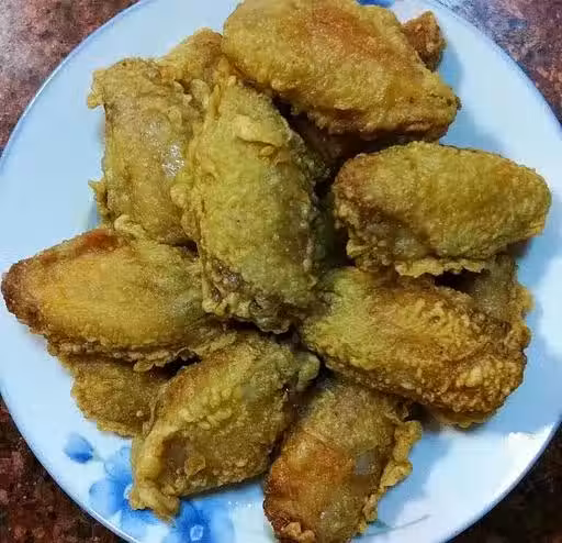 食材:雞翅、生粉、麵粉、五香粉、白鬍椒粉、鹽、雞精、白沙糖 、雞蛋