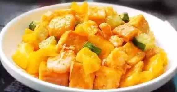 2.平底鍋放油燒熱,將豆腐塊拍一層干澱粉,入鍋煎至金黃色,撈出控油;另起油鍋,放青紅椒片、菠蘿塊火龍果塊,加調味汁炒勻,再加豆腐炒至入味,用鹽調味即可。