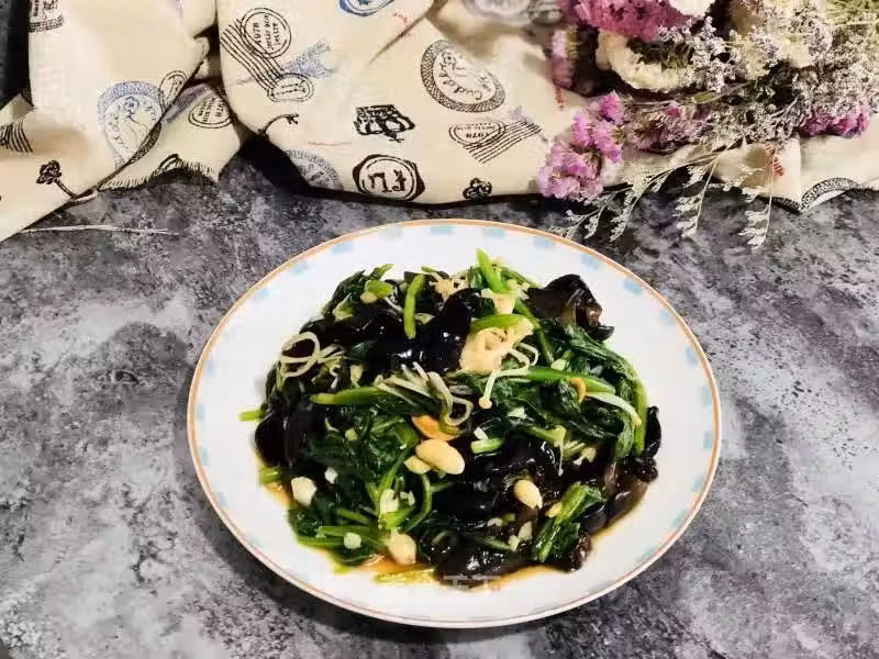 3、焯好的菠菜、金針菇和木耳用涼水過一下,攥干水分備用。