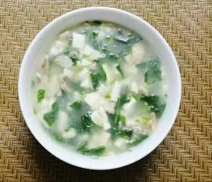 5、入薺菜和豆腐,轉中火煮開,期間用湯勺輕輕推動幾下