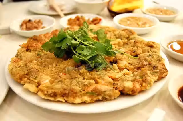 2、用旺火燒熱平鼎有足夠熱度後,加入少許豬油,將蚝仔、粉水混和成漿狀,用匙再調和後下鼎,撥開薄薄1片,煎至成形後,下半份蛋液,煎至金黃色,反轉面,倒下餘下之蛋液,又煎至黃色上碟,灑上少許胡椒粉,並伴上芫荽葉。食用時蘸上潮汕特有的魚露。