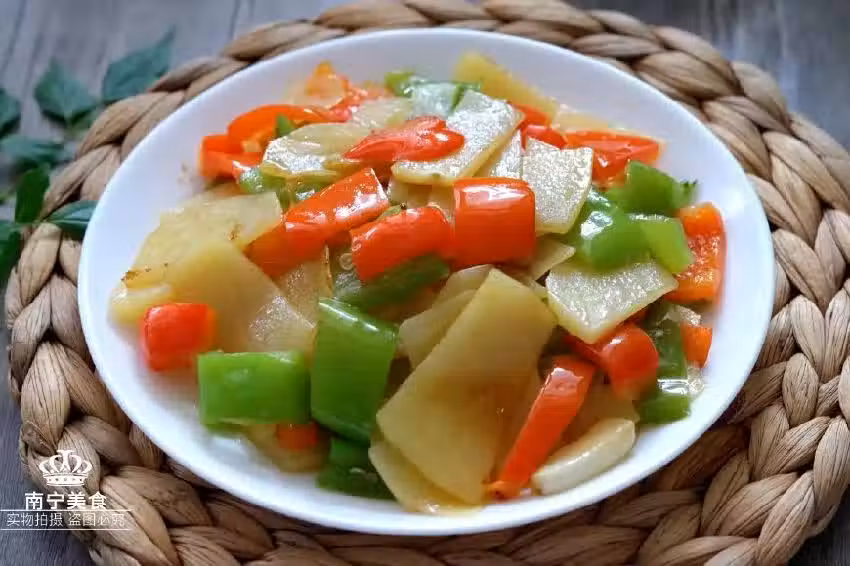 紅甜椒1個、青椒1根、土豆1個、蒜米3粒、食鹽一湯匙、生抽1湯匙