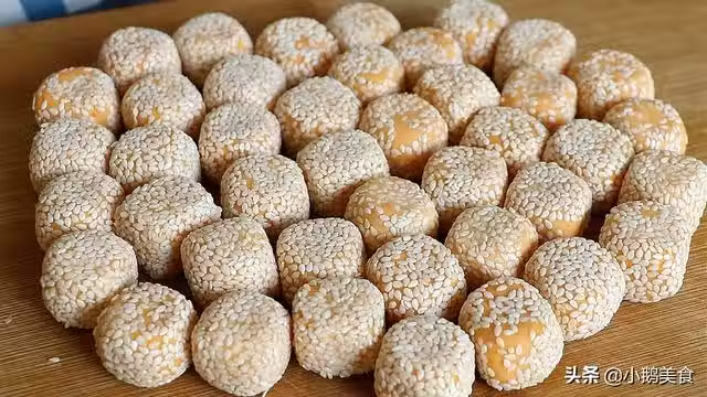 如果沾不上芝麻,或一捏就開裂,那就是劑子太幹了,我們可以把小劑子蘸一層清水,再攥一攥,把水分攥至完全吸收,然後揉圓,這個時候,小圓球上就是濕乎乎的,非常容易蘸上芝麻。