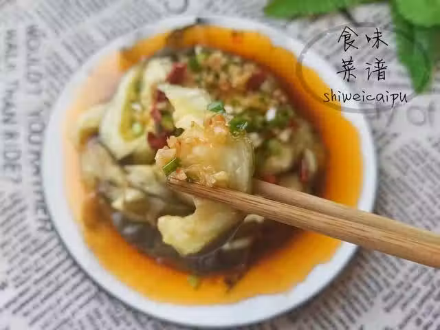 4、將料汁淋在茄子上,即可開吃,濃濃的香味,聞著就很有食慾,下酒又下飯。