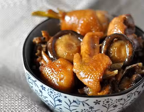 ◆ 倒入醬油,翻炒至雞腿肉都裹上顏色。倒上黃豆醬,翻炒均勻;放入泡好的香菇,和泡香菇的水,再加上適量的清水,大火燒開後,轉中火,燒至醬汁濃稠,轉大火,收汁,調味。