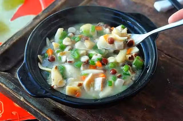 這是一道潮汕風味菜!大排檔、酒樓都會有!很多年前在汕頭的時候吃到過,軟糯粘稠、清爽又開胃,當時就著迷了。幾年過去,一直讓我惦記至今,實在是太想念這個味道了!網上搜尋到了這個食譜,自己在家動手做啦,沒想到這麼簡單,提前將食材都準備好,5分鐘就出鍋了,香濃熱乎,大冬天裡,一碗下肚渾身都暖和起來,兒子一口吃喝了兩大碗,直呼好吃!