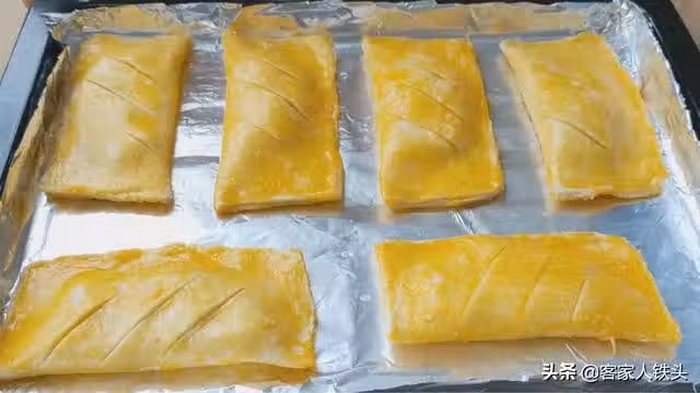 第八步:沒烤箱的朋友,可以用平底鍋來煎,鍋中下少許油,把油燒熱,油熱後調小火,把菠蘿派放進去慢慢煎,一面煎好,給它翻過面來,兩面煎至有點焦黃就可以出鍋了。