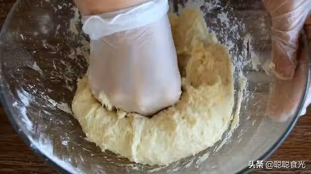 步驟三:然後下手揉面,根據麵糰的軟硬度再酌情加入剩下的水,面絮揉成團手感是很軟的,如果麵糰手感偏硬,邊揉邊加入一些水,剛開始有一些粘手,揉一會兒麵糰就成團不粘手了,如果實在很粘說明水分太多,再少加一點麵粉就可以。