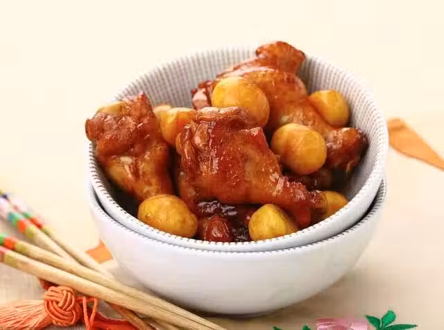 【材料】雞翅根10個、番茄醬50克、熟栗子150克、油2勺、白糖40克、鹽8克、白鬍椒3克、蔥醬1勺