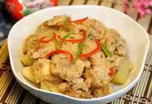 4、將雞塊揀出鋪在碗底,土豆鋪在上面,反扣在盤子裡即可,撒上少量的胡椒粉和青紅椒絲即可.