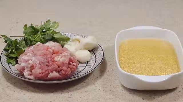 豬肉,小米,馬蹄,小蔥,香菜,鹽,雞精,生抽,蚝油,料酒,白鬍椒粉,香油。