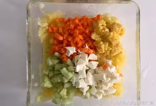 10 、把胡蘿蔔丁、黃瓜丁、蛋白丁和蛋黃泥放入土豆泥中