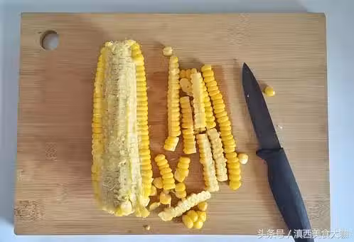 3 、撈出玉米放涼,用刀切下玉米粒。