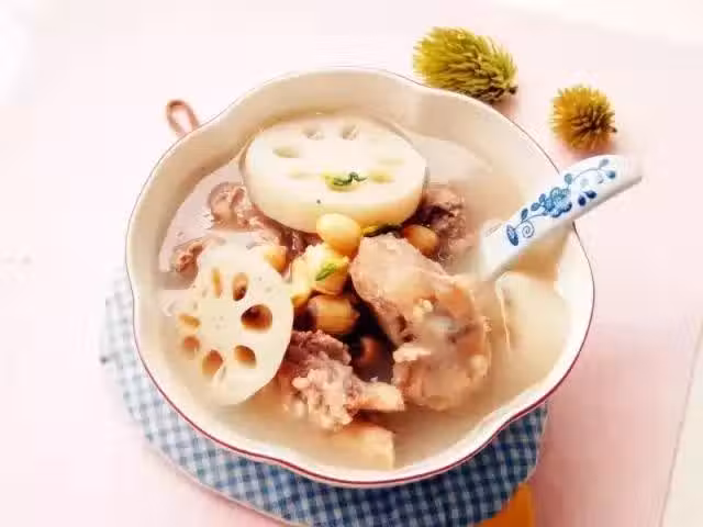 6、把蓮藕、排骨及湯汁一起倒進砂鍋,再燉30分鐘,揀出生薑、香蔥不用,放精鹽、胡椒、味精即可。