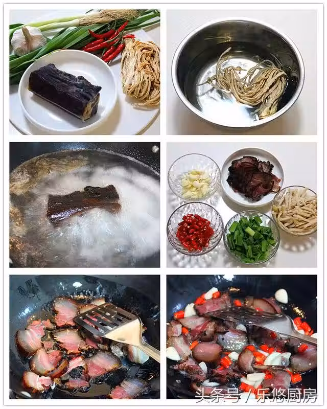 第五步:鍋中加適量底油,然後將臘肉放入鍋中煸炒。