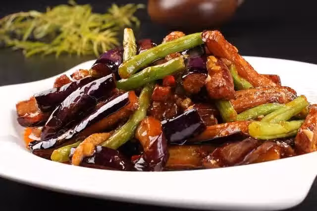 1、準備一大碗水並且加上鹽,把切塊的茄子放進去,浸泡15分鐘後瀝干水分;將食用油倒入炒鍋中用中火加熱,倒入茄子,翻炒至變軟後盛出;