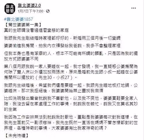 每次婆婆不合理的對待都是在私底下,在老公面前又裝作一副很慈祥模樣,遇到種種驚奇事蹟的她,也忍不住飆罵「生眼睛沒看過這麼變態的家庭」,並嘆道:「我先生既然一直活在媽媽不管怎樣都對的世界裡,各種神奇的事情,大家婆婆有比我家神奇的嗎?」