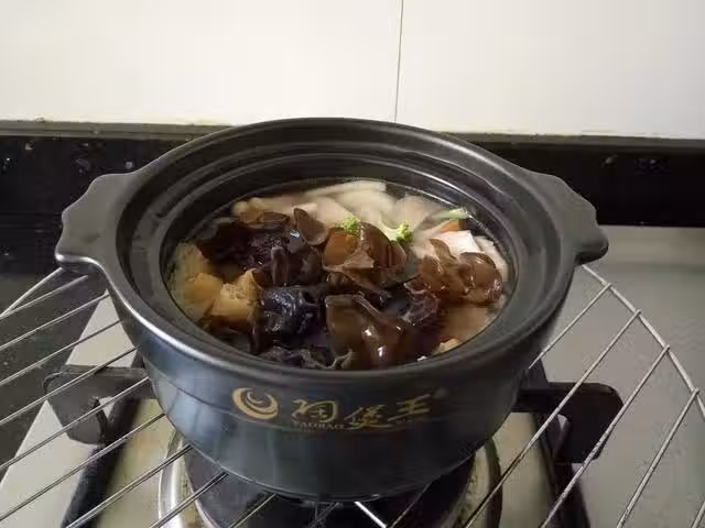 5.轉移入砂鍋中,加適量水,加入黑木耳,少許料酒。