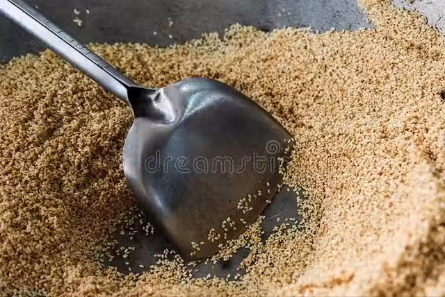 2、炒鍋燒熱、燒乾之後,將白芝麻倒入其中,開始翻炒,一定要完全炒熟哦,炒到表面發黃,並且出現一定的爆裂聲之後,就可以取出來放涼了,等徹底涼透後,就可以拿來打芝麻醬了。