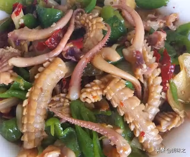魷魚、青椒、洋蔥、蔥、紅辣皮子、蒜、花椒、姜、鹽、油、雞精,胡椒粉,耗油、味極鮮。