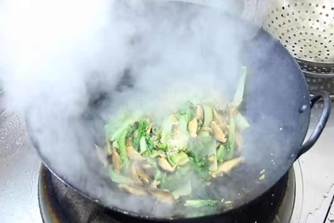 4.然後倒入小白菜大火翻炒至斷生,加入雞粉1克,勾入一點水澱粉,快速收一下湯汁,最後倒入青紅椒片翻炒幾下,美味即成。