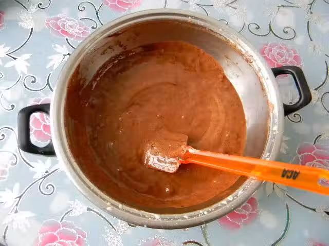7、倒入模具,震出大氣泡。我用的是18厘米x18厘米的方磨具