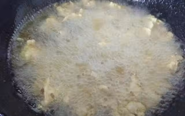 接下來就是炸酥肉了,鍋里放入適量的油,最好是菜籽油,因為菜籽油炸出來的美食會更香一些,油放鍋里煎熱後,就可以把腌制好的豬肉條一條一條的放進鍋里,然後用鍋鏟攪動一下,炸至金黃後就可以從鍋里撈出來了。