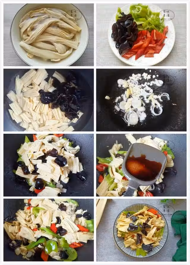 5、倒入青紅椒,翻炒至斷生,再倒入腐竹和黑木耳,加小半碗清水,翻炒均勻。