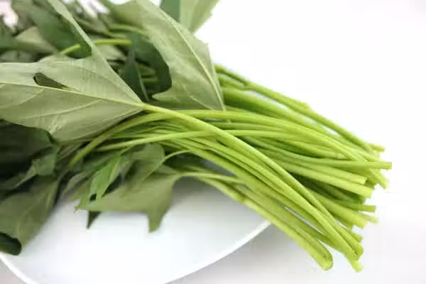 大蒜剝皮搗成茸。炒鍋置火上,放素油燒至四成熱,放人大蒜茸炒出香味,加入嫩紅薯葉莖翻炒