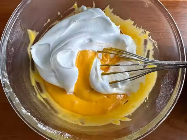 5、再倒回蛋白盆里繼續拌均勻,最後用刮刀徹底拌均勻,麵糊最後的狀態是這樣細膩有光澤的,我還加了一點檸檬皮,一定要試試這個口味的,超級好吃;