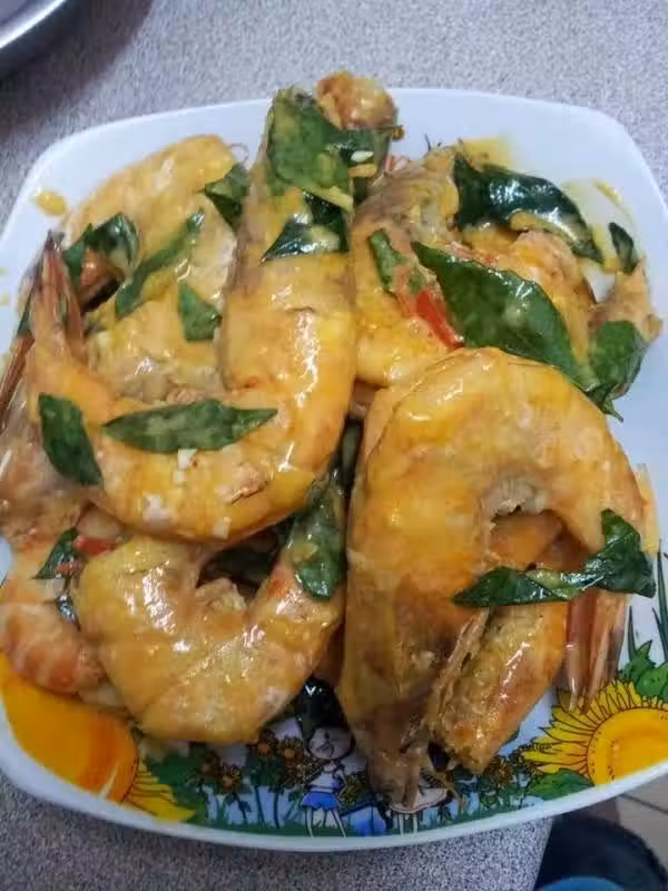 大蝦15隻,蛋黃3粒,淡奶1湯匙,牛油3湯匙,紅辣椒1條(切絲),咖哩葉(洗淨)適量