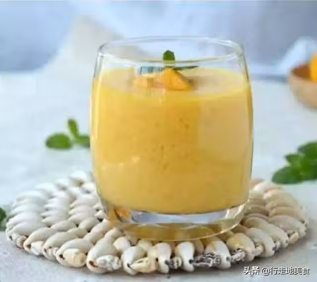 3將榨好的汁倒入杯中,再放入芒果粒放薄荷葉點綴。