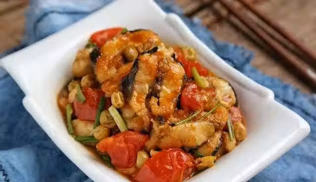 2,鍋內放入適量的食用油,放入鱘龍魚煎至兩面金黃,取出備用。