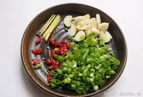 2 、將輔料生薑、蒜頭、蔥、辣椒切好,如果是做給產婦,請將辣椒和生薑、蒜頭幾樣食材去掉,只有蔥即可。