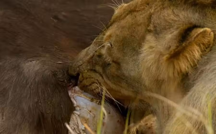 饑腸轆轆的母獅按倒野牛,剛要美餐下秒「屎漿噴滿臉」,母獅表情複雜生無可戀