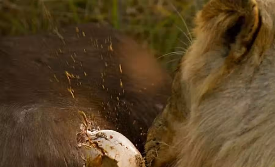 饑腸轆轆的母獅按倒野牛,剛要美餐下秒「屎漿噴滿臉」,母獅表情複雜生無可戀