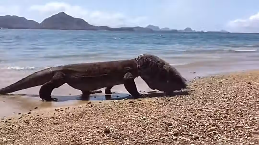 最近一位遊客登上了科莫多島,在遊客到達海灘的時候,遠遠地看到一隻「怪龍」從海水中向著沙灘走來,它似乎帶著「頭盔」!這只怪龍頭部非常巨大,在遠處看不到它的鼻子、眼睛和嘴巴,整個頭部都包裹在「頭盔」裡。突然間的發現讓他既害怕又興奮,他快步靠近怪龍。
